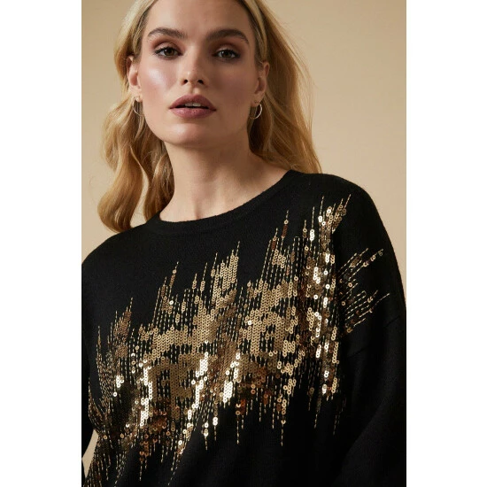 Our on-trend collection of jumpers & cardigans has everything you need for the season ahead. Keep things cosy with chunky knitted designs, or throw on a light layer with our versatile cardigans. From timeless shrugs and longline pieces, to cosy boleros and coatigans we’ve got you covered. Style: Black Sequin Flash JumperIdeal for: Occasion