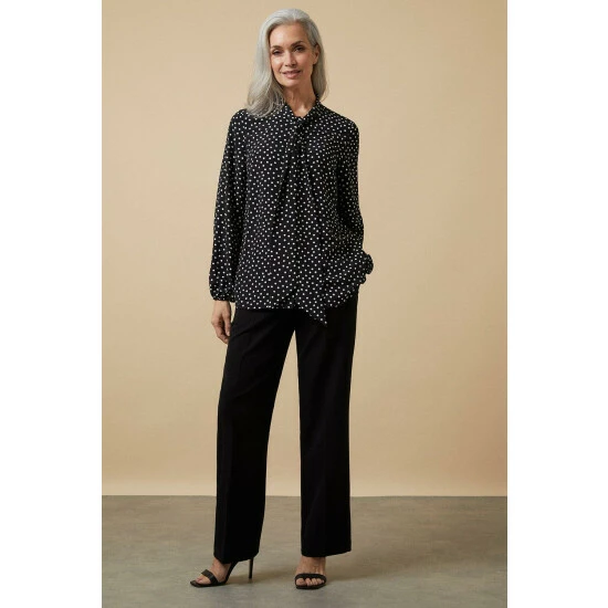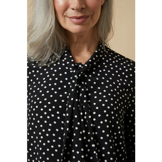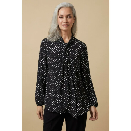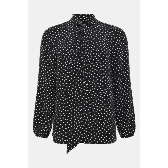 Complete the look with our new season tops. From casual camis to smart office tops to glam ruffled evening styles, we’ve got you covered for whatever you have in the diary. Make a style statement with puff sleeves and bold prints, or keep things classic with a chic cami or ruffles top. Intricate embellishments and fine prints are set to bring your everyday wardrobe to life, whilst a variety of fits are designed to flatter.Style: Black Spot Tie Neck TopIdeal for: Daywear