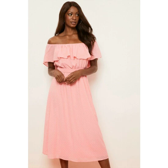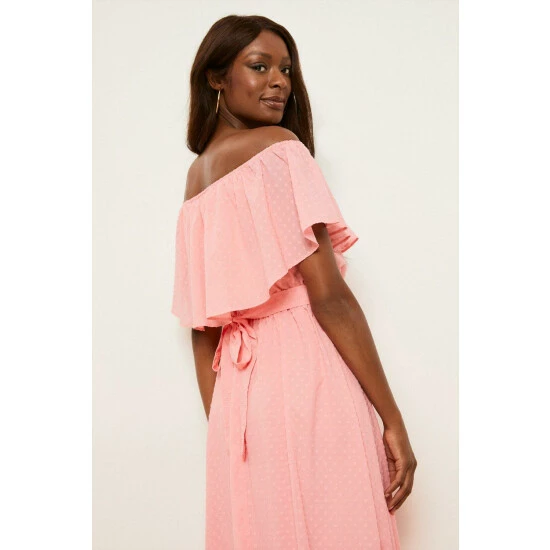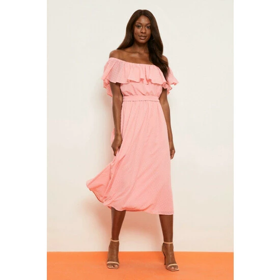 Coral Dobby Off-shoulder Belted Midi Dress