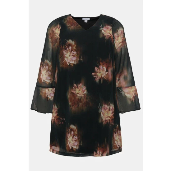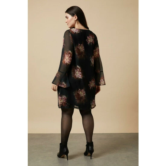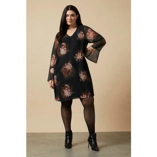 Curve Blurred Floral Ruffle Sleeve Shift Dress