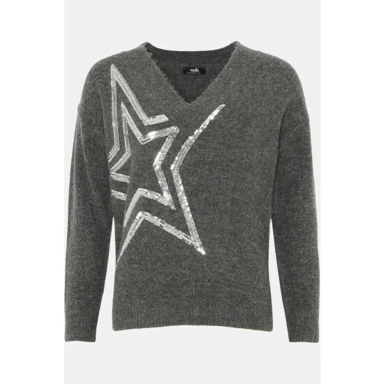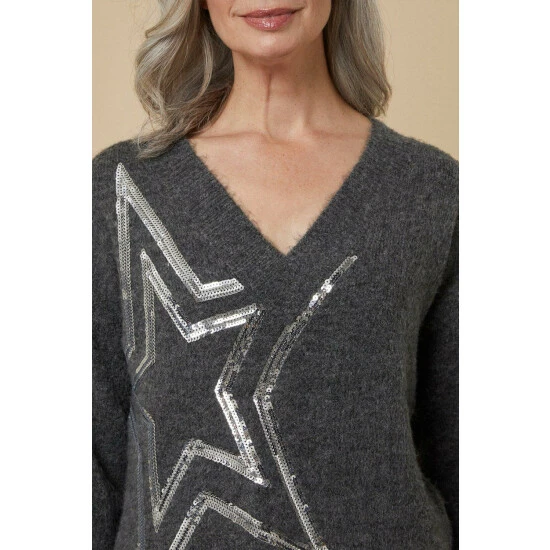 Our on-trend collection of jumpers & cardigans has everything you need for the season ahead. Keep things cosy with chunky knitted designs, or throw on a light layer with our versatile cardigans. From timeless shrugs and longline pieces, to cosy boleros and coatigans we’ve got you covered. Style: Grey Double Sequin Star V Neck JumperIdeal for: Occasion