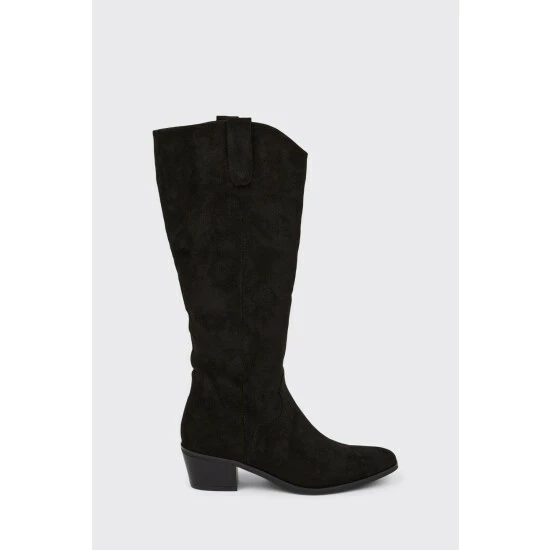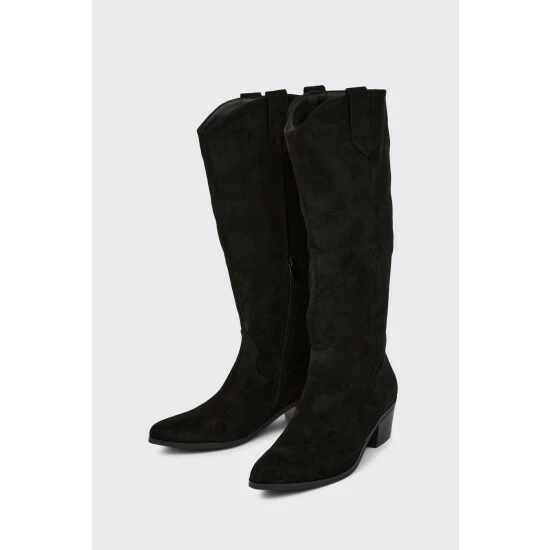 Boots made for walking. From on-trend over the knee designs, to classic chelsea boots and cool chunky styles, these are the boots to add to your collection.Style: Harriet Microfibre Western Detail Low Heel Knee BootLength: Approx. RegularIdeal for: WinterDesign: Statement