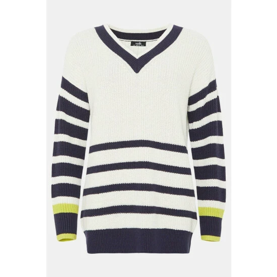 Our on-trend collection of jumpers & cardigans has everything you need for the season ahead. Keep things cosy with chunky knitted designs, or throw on a light layer with our versatile cardigans. From timeless shrugs and longline pieces, to cosy boleros and coatigans we’ve got you covered. Style: Ivory Striped V Neck JumperIdeal for: Daywear