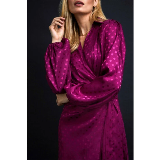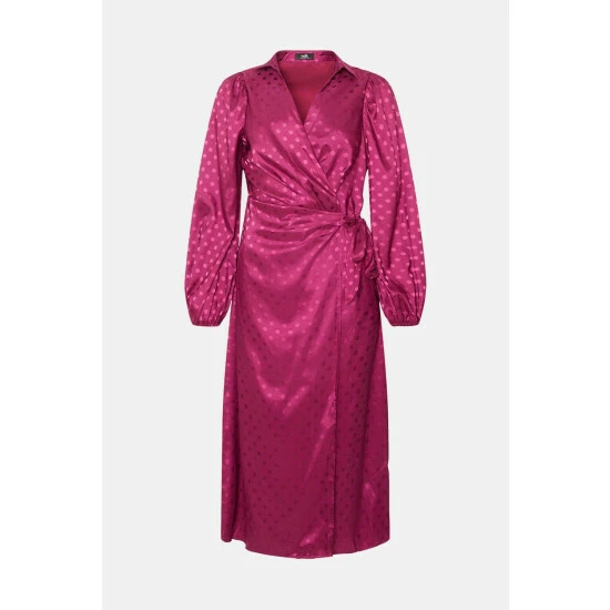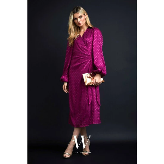 Part of W, a carefully curated collection of luxe, trend-lead pieces. W is an elevated selection of essential styles. Make a statement in this satin look jacquard dress this season. The wrap front waistline and knot detail mean this midi dress is sure to flatter, just team with heels to complete the look.Style: Jacquard Spot Wrap Midi DressLength: Approx. 123cmFit: RegularIdeal for: OccasionDesign: Wrap