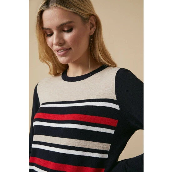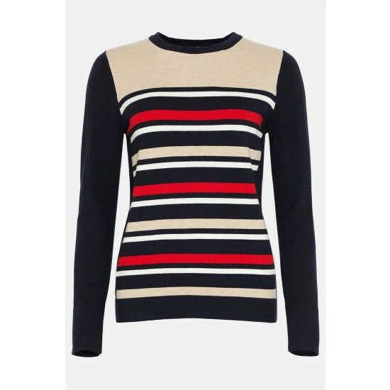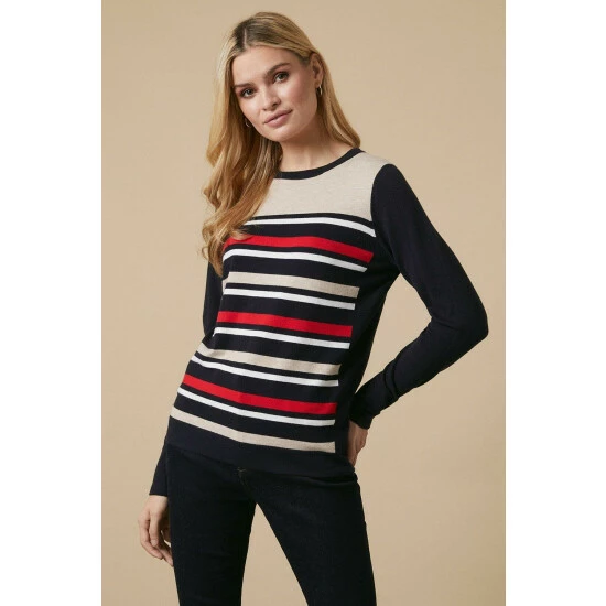 Our on-trend collection of jumpers & cardigans has everything you need for the season ahead. Keep things cosy with chunky knitted designs, or throw on a light layer with our versatile cardigans. From timeless shrugs and longline pieces, to cosy boleros and coatigans we’ve got you covered. Style: Linear Striped Crew Neck JumperIdeal for: Smart