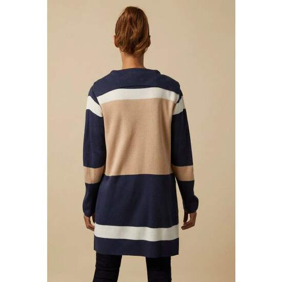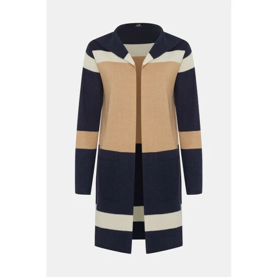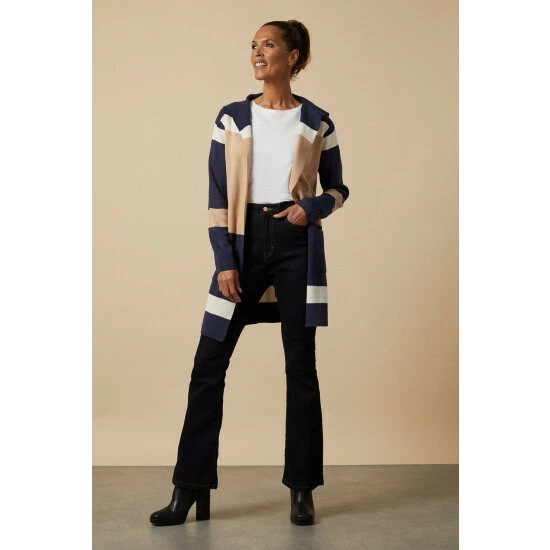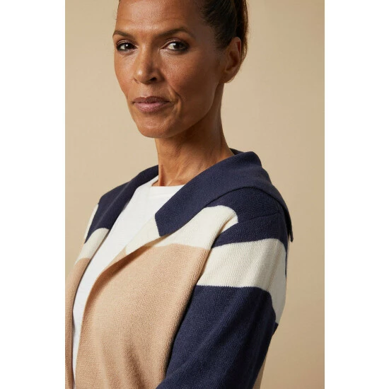 Our on-trend collection of jumpers & cardigans has everything you need for the season ahead. Keep things cosy with chunky knitted designs, or throw on a light layer with our versatile cardigans. From timeless shrugs and longline pieces, to cosy boleros and coatigans we’ve got you covered. Style: Navy Collar Striped CoatiganLength: Approx. 86cmFit: RegularIdeal for: DaywearDesign: Collar