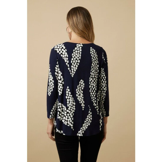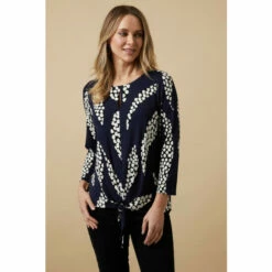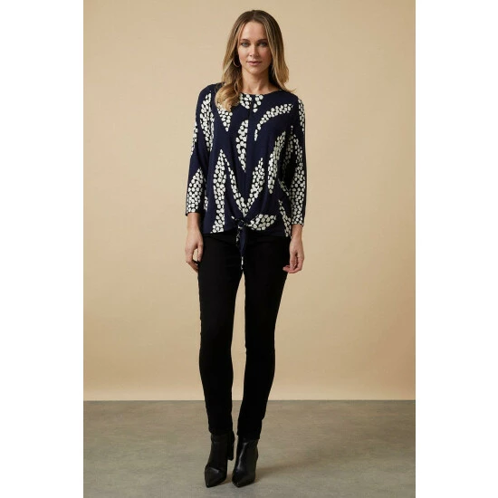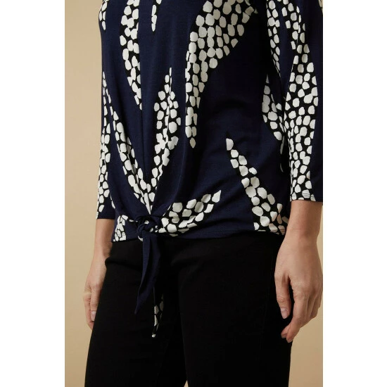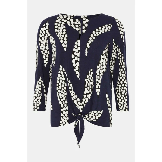 Navy Spot Palm Print Key Hole Tie Front Jersey Top
