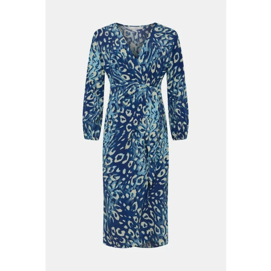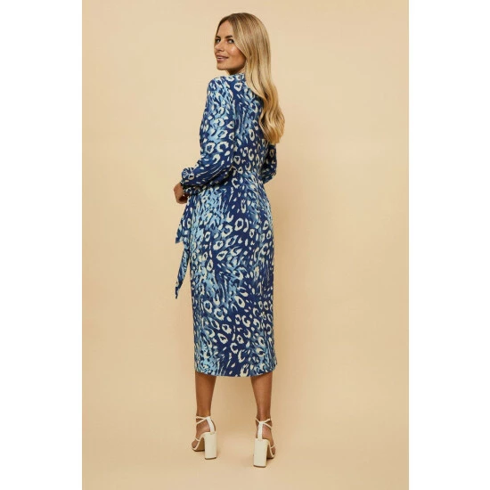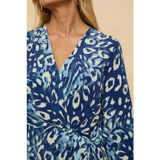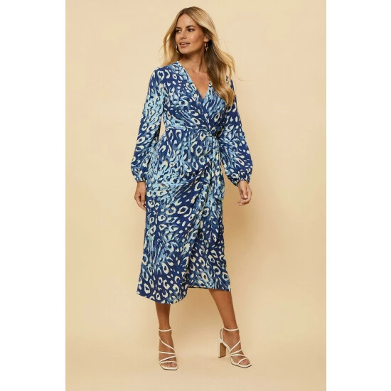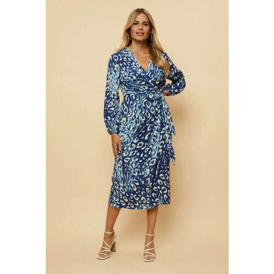Petite Navy Animal Wrap Long Sleeve Midi