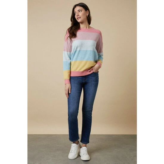 Our on-trend collection of jumpers & cardigans has everything you need for the season ahead. Keep things cosy with chunky knitted designs, or throw on a light layer with our versatile cardigans. From timeless shrugs and longline pieces, to cosy boleros and coatigans we’ve got you covered. Style: Rainbow Stripe JumpersIdeal for: Daywear