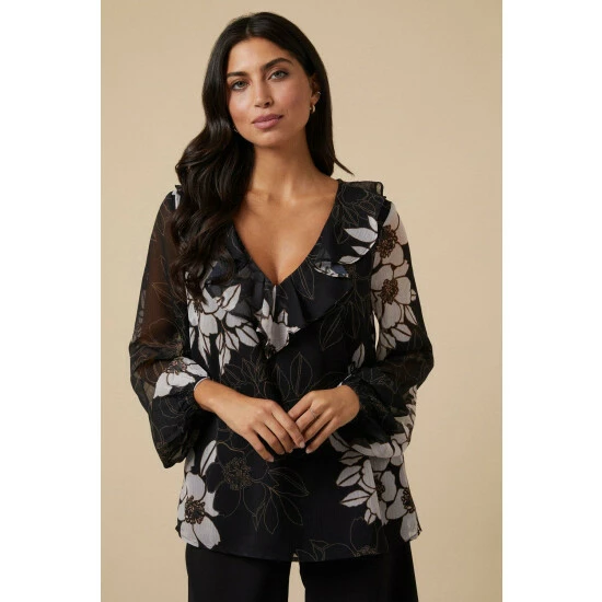 Complete the look with our new season tops. From casual camis to smart office tops to glam ruffled evening styles, we’ve got you covered for whatever you have in the diary. Make a style statement with puff sleeves and bold prints, or keep things classic with a chic cami or ruffles top. Intricate embellishments and fine prints are set to bring your everyday wardrobe to life, whilst a variety of fits are designed to flatter.Style: Tall Black Floral Ruffle Front BlouseLength: Approx. 68cmFit: RegularIdeal for: DaywearDesign: Ruffle