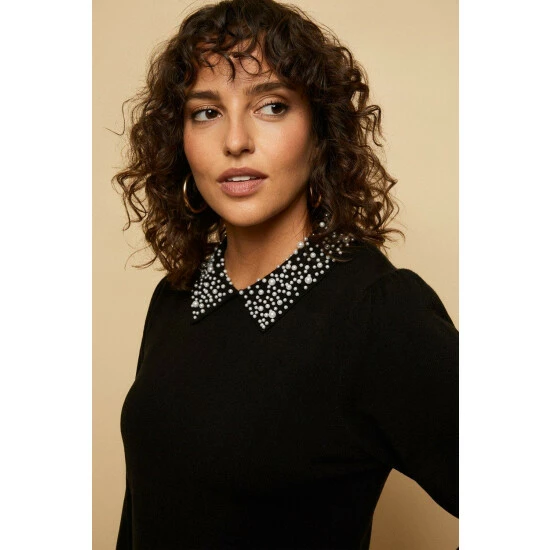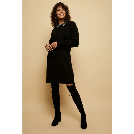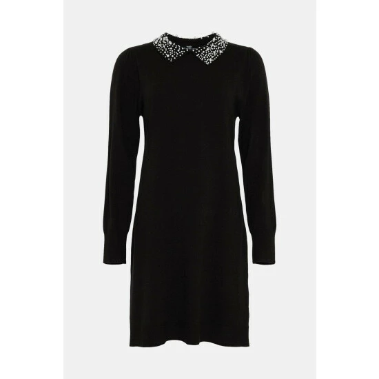 Tall black Pearl Embellished Collar Knitted Dress