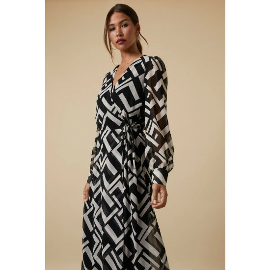 Tall Mono Geo Blouson Sleeve Wrap Midi Dress