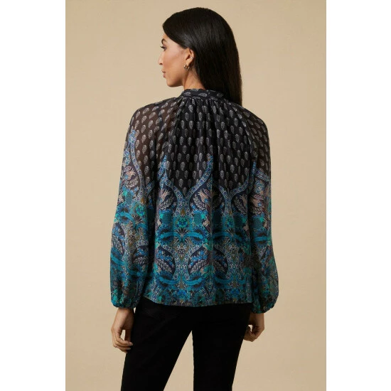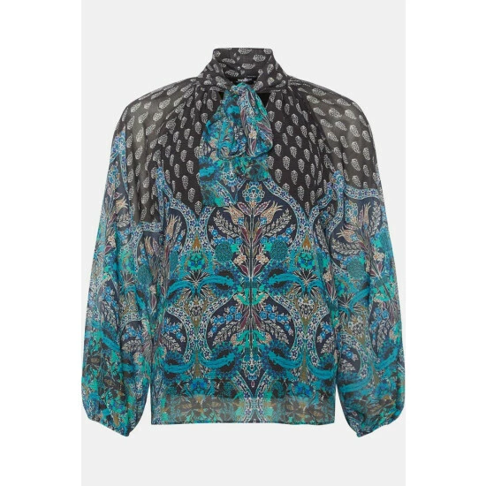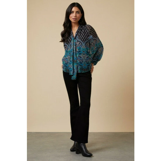 Complete the look with our new season tops. From casual camis to smart office tops to glam ruffled evening styles, we’ve got you covered for whatever you have in the diary. Make a style statement with puff sleeves and bold prints, or keep things classic with a chic cami or ruffles top. Intricate embellishments and fine prints are set to bring your everyday wardrobe to life, whilst a variety of fits are designed to flatter.Style: Teal Border Tie Neck TopIdeal for: Daywear